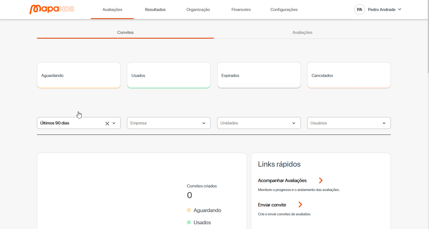 Para enviar um convite, você deverá acessar a aba Avaliações. Dentro dela, estará o menu Envio de Avaliação.