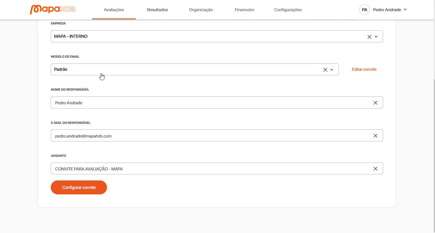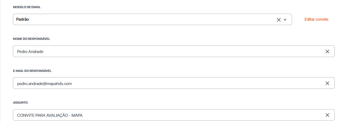 4) Dados do responsável: Confira os dados do responsável e o assunto do convite. Ele será preenchido automaticamente baseado em seu usuário. Você pode editar esse campo se quiser colocar outro responsável para acompanhar a avaliação. O responsável será notificado por e-mail quando a avaliação for concluída.