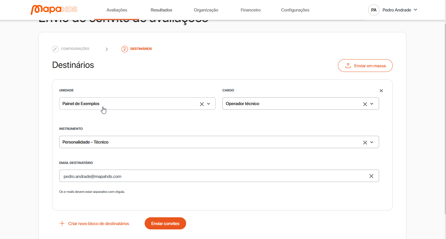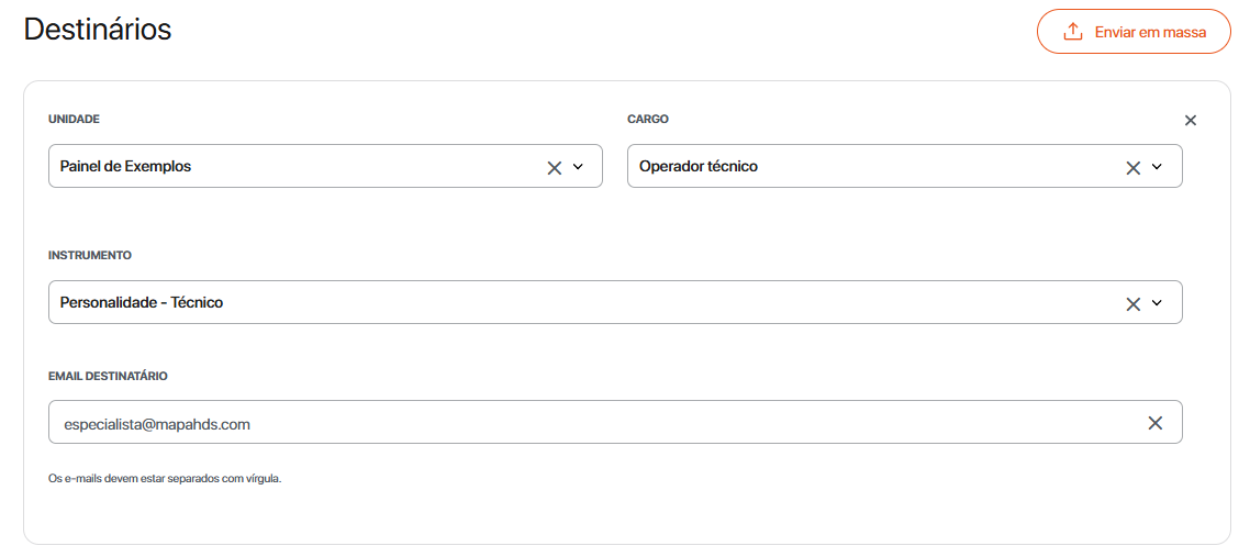 8) E-mail destinatário: Preencha o(s) email(s) do(s) participante(s) que receberá (ão) a avaliação. Você pode adicionar mais de um e-mail ao separá-los por vírgula.