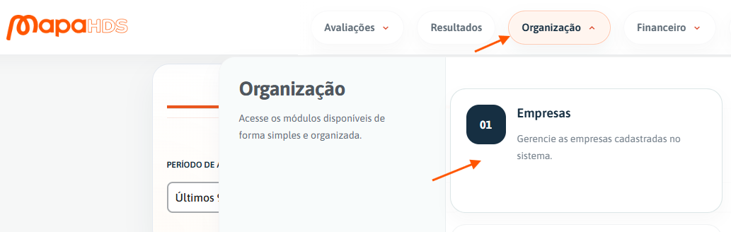 1) Primeiramente, acesse o menu Organização e em seguida em Empresas.