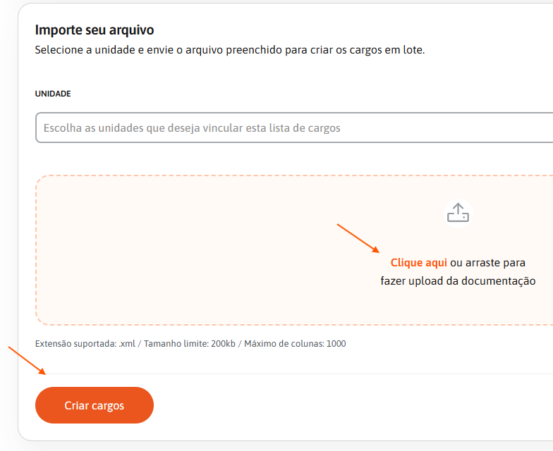 4. Quando baixar a planilha com os cargos, volte para a plataforma e, se ainda não possuir unidades, não precisa preencher o campo “Unidade”. Caso você já tenha unidades cadastradas, selecione em quais unidades esses cargos deverão aparecer ao criar/enviar os convites.