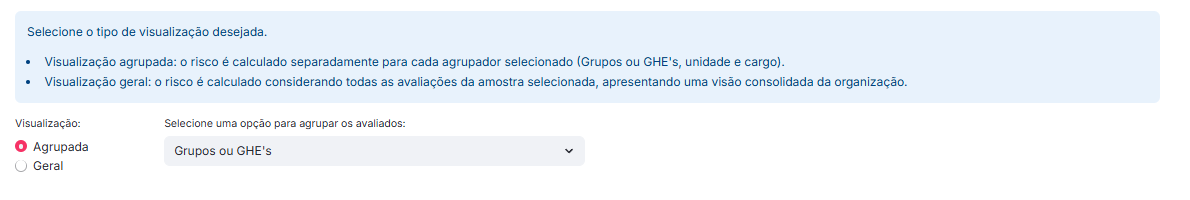 2. Selecione o tipo de visualização, se será agrupada através dos Grupos/GHE's, Cargos ou Unidades ou se visualizará de forma Geral, visualizando da organização como um todo.