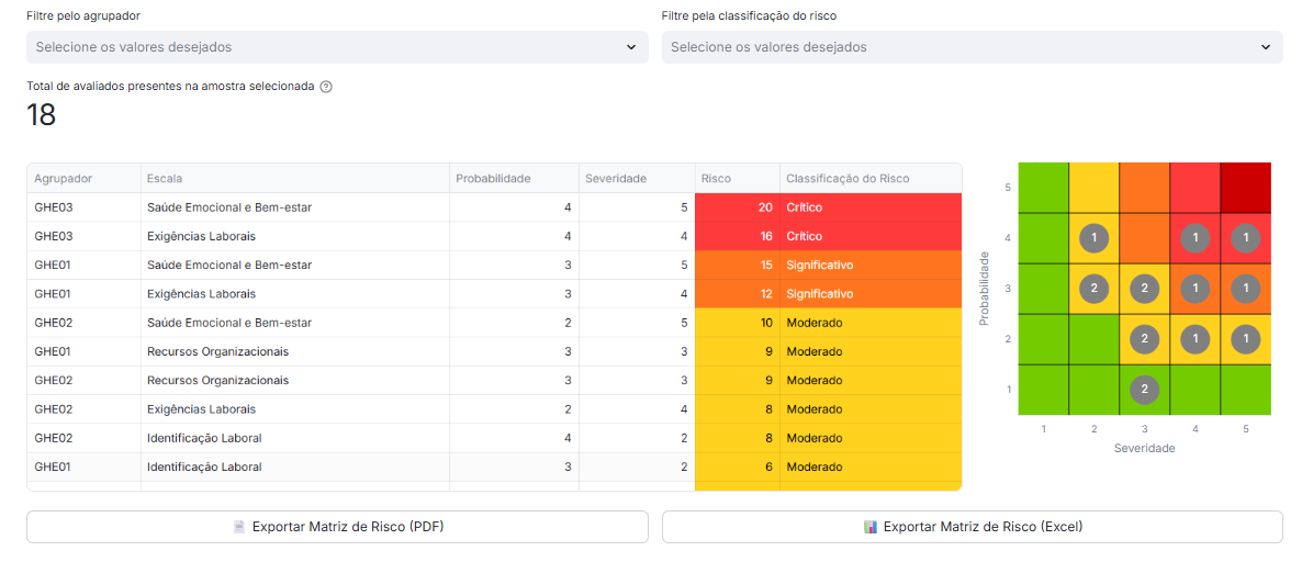 3. Utilize a filtragem para focar em grupos específicos, ou em classificações distintas do Risco para nortear seus resultados. Você pode exportar a Matriz tanto por PDF como Excel ao final do gráfico.